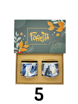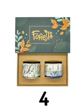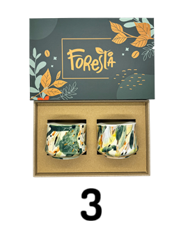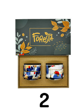 V padajočem meniju lahko izbirate med različicami 1–4 (fotografije so označene s številkami), pri čemer je vsak par skrbno sestavljen glede na barvne odtenke in slog. Celoten komplet je zapakiran v elegantno luksuzno darilno škatlo Foresta, zaradi česar je popolno darilo za pare, ljubitelje ročne keramike, posebne priložnosti ali domiselna poslovna darila.